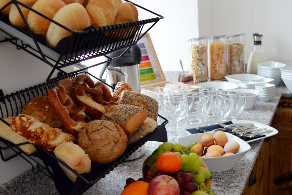 Täglich von 6:30 Uhr bis 9:00 Uhr starten unsere Hotelgäste gut in den Tag: Mit einer großen Auswahl an Backwaren, Obst und Säften, Tee und Kaffee, gemischten Wurst- und Käseplatten, Joghurt- und Quarkspeisen.